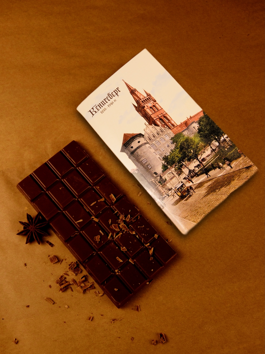 Темный шоколад (55% какао). Упаковка в виде открытки с изображением Кёнигсбергского Замка.