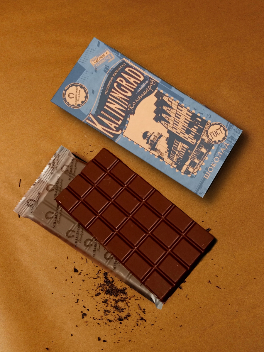 Молочный шоколад (35% какао). Обертка с изображением Рыбной деревни в Калининграде.