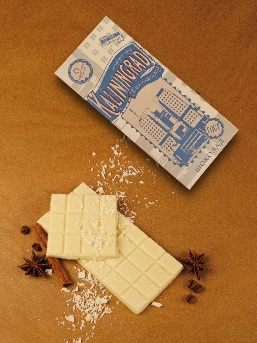 Белый шоколад (30% масла какао). Обертка с изображением Дома Советов в Калининграде.