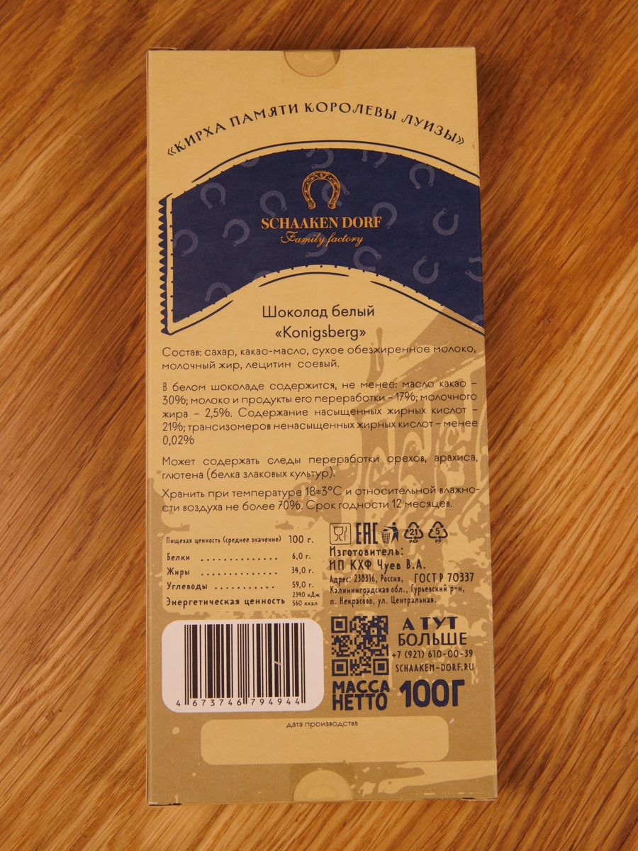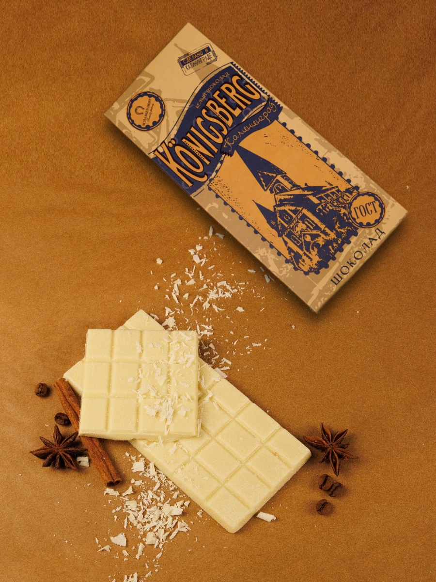 Белый шоколад (30% масла какао). Обертка с изображением Кирхи памяти Королевы Луизы в Кёнигсберге.