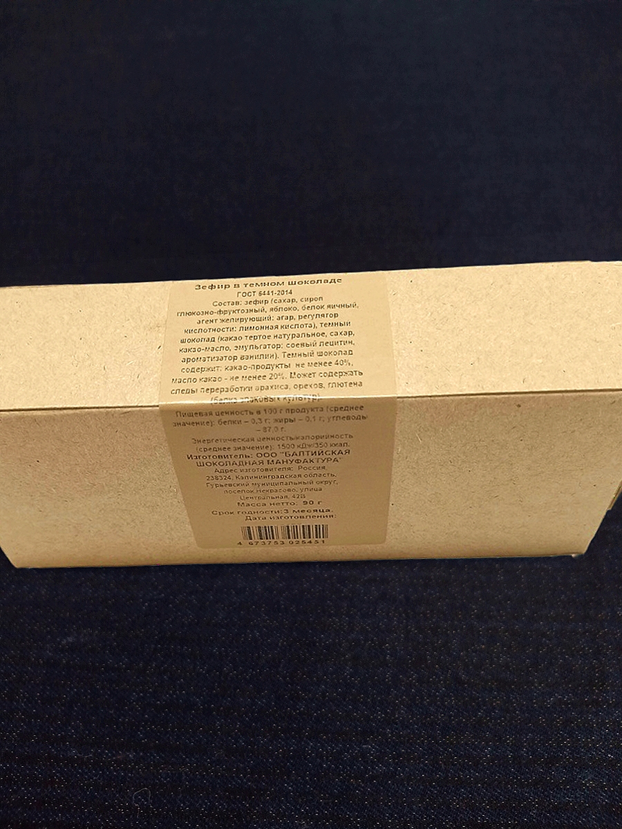 Состав: сахар, сироп глюкозно-фруктозный, яблоко, белок яичный, агент желирующий: агар, регулятор кислотности: лимонная кислота, темный шоколад (какао тертое натуральное, сахар, какао-масло, эмульгатор: соевый лецитин 0,4%, ароматизатор ванилин)