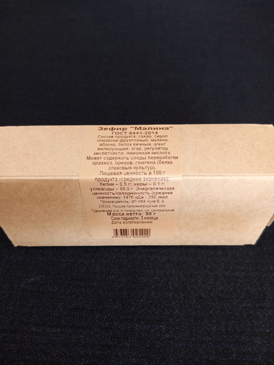 Состав: сахар, сироп глюкозно-фруктозный, малина, яблоко, белок яичный, агент желирующий: агар, регулятор кислотности: лимонная кислота.